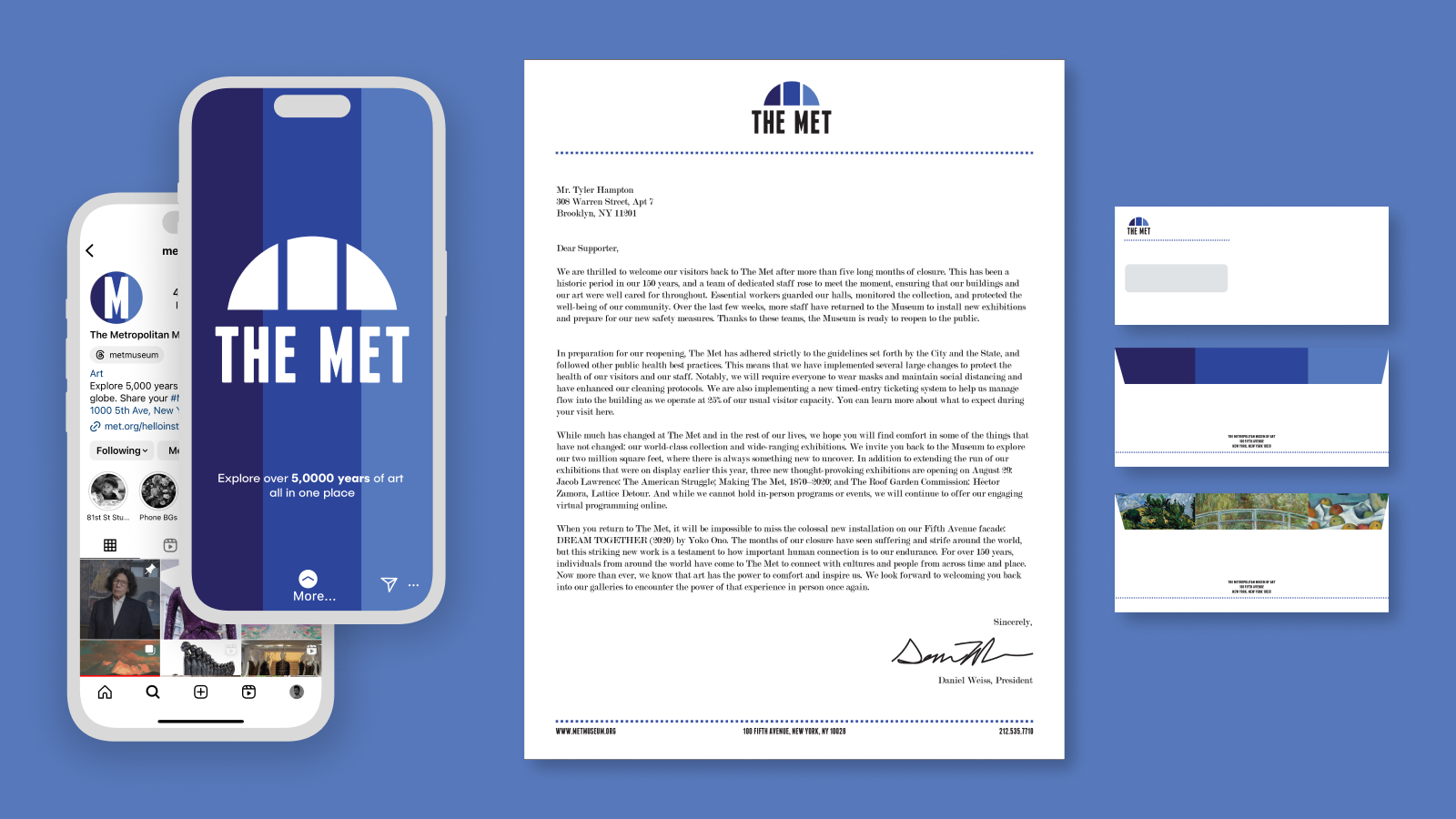 Museums classically use snail mail campaigns as well, as larger donors tend to be older and more established, so I also designed letterhead and envelopes to approach marketing from this angle as well.
