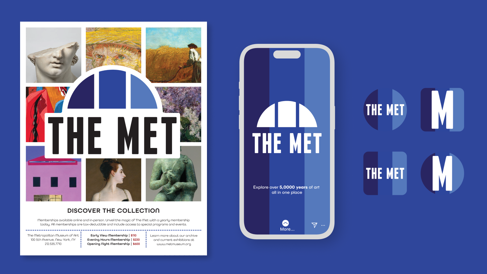 Typographically, the current Met logo is rather structured and refined, so my redesign updated and refreshed it, utilizing Franchise Bold in the logo itself, and All Round Gothic for other display text.